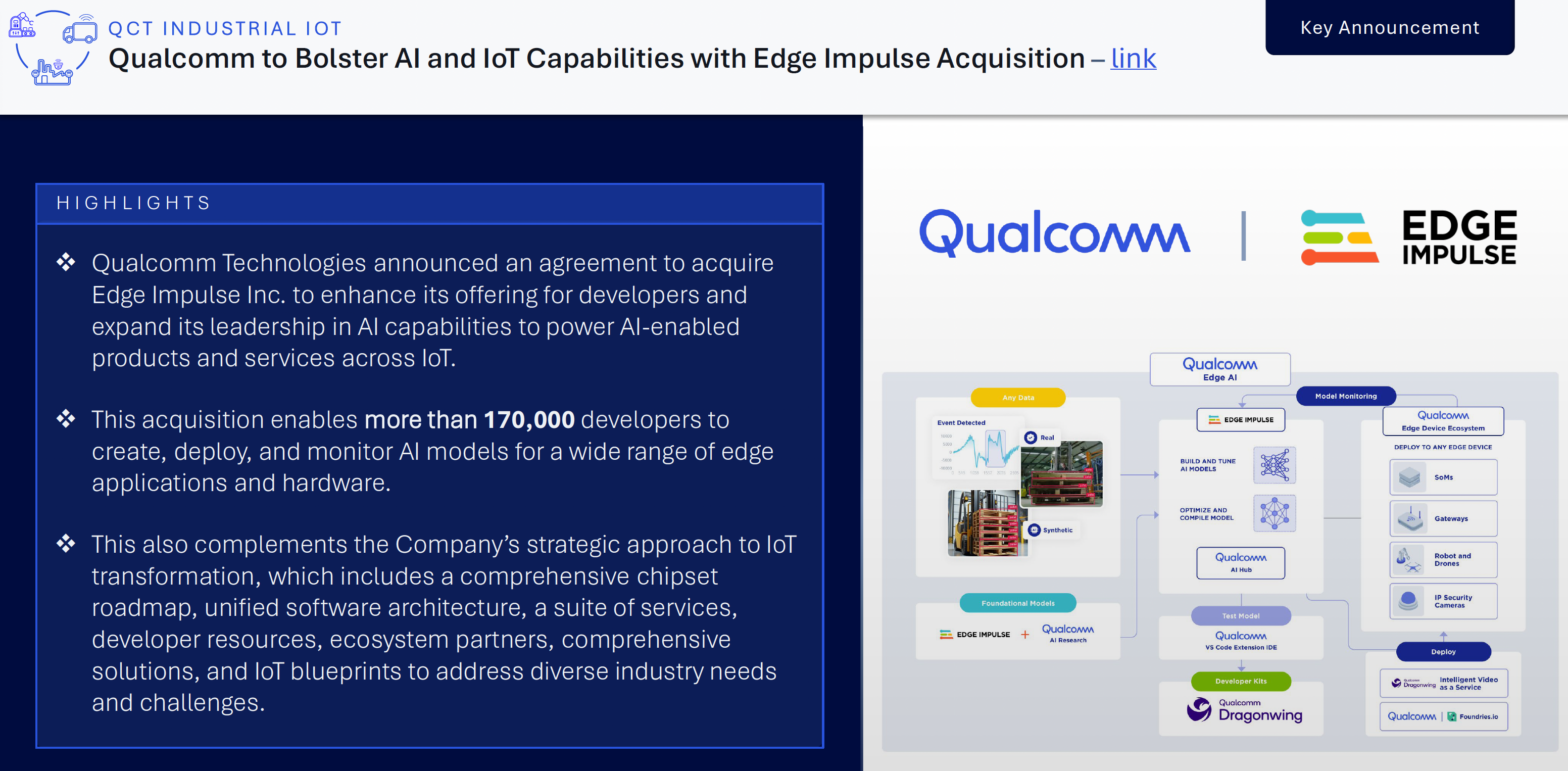 - IoT 부문: Edge Impulse 및 FocusAI 인수 완료. 17만 명 이상의 개발자 대상 AI 모델 구축 생태계 확보.