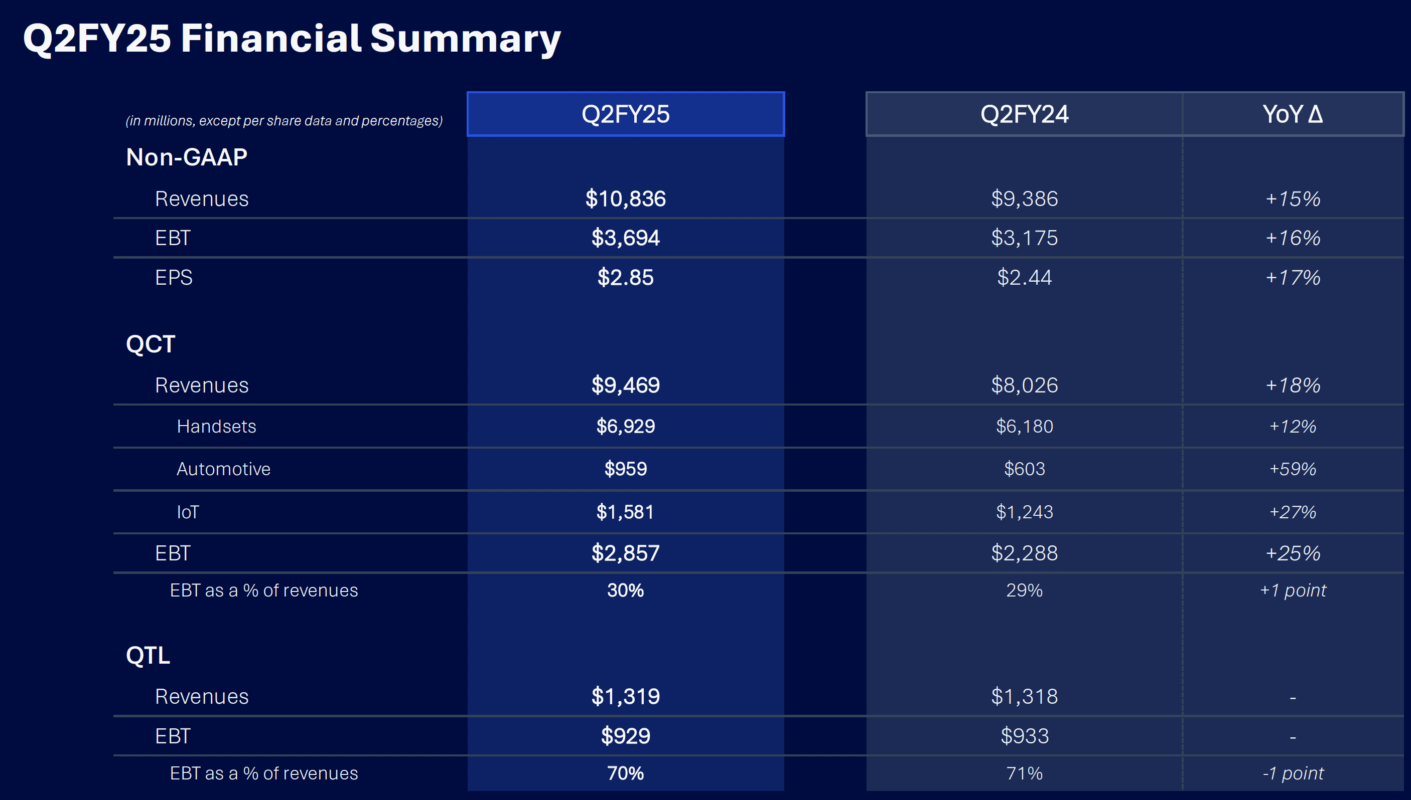 퀄컴은 2025년 회계연도 2분기에 시장의 예상을 웃도는 실적을 발표하며 강한 실적 회복세를 입증했습니다. **총 매출은 전년 대비 17% 증가한 109.8억 달러(Non-GAAP 기준)**로, 애널리스트 예상치였던 106.5억 달러를 3.1% 상회했습니다. 또한, 비GAAP 기준 주당순이익(EPS)은 $2.85로 집계되며 시장 기대치($2.82)를 소폭(1.2%) 웃돌았습니다.