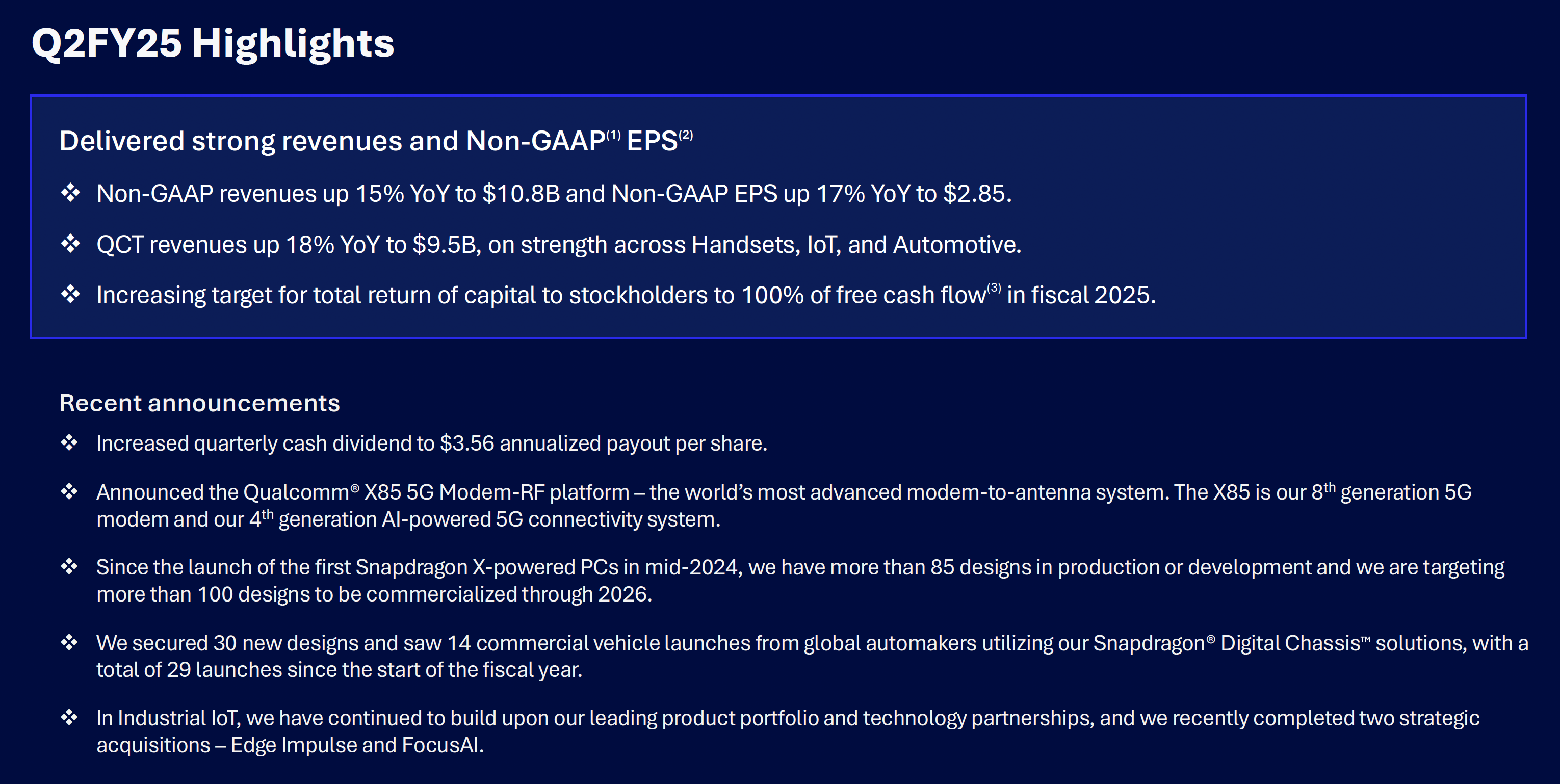 마지막으로, 퀄컴은 이번 분기에 27억 달러를 주주에게 환원했습니다. 여기에는 9.4억 달러의 배당금과 17억 달러 규모의 자사주 매입이 포함됩니다. 특히 회사는 2025년 회계연도 전체에서 잉여현금흐름의 100%를 주주 환원에 사용하겠다는 방침을 재확인했습니다.