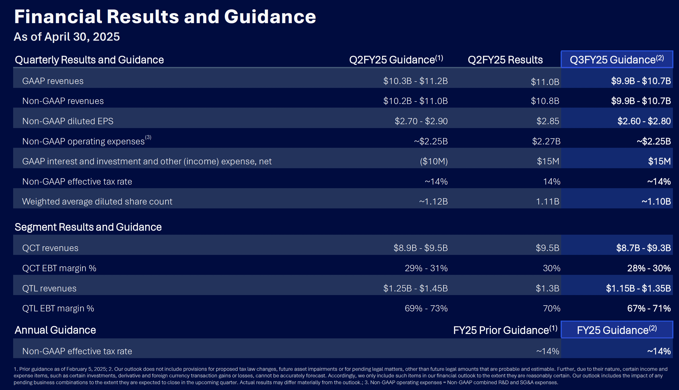 마지막으로, 퀄컴은 이번 분기에 27억 달러를 주주에게 환원했습니다. 여기에는 9.4억 달러의 배당금과 17억 달러 규모의 자사주 매입이 포함됩니다. 특히 회사는 2025년 회계연도 전체에서 잉여현금흐름의 100%를 주주 환원에 사용하겠다는 방침을 재확인했습니다.