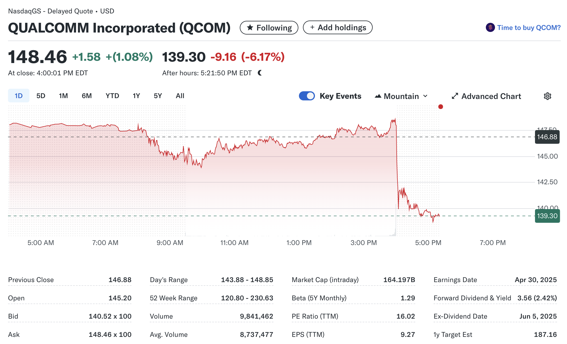 실적 발표 직후 퀄컴 주가는 5.3% 하락하여 $140.29로 마감했습니다. 그 주요 원인은 다음과 같습니다.