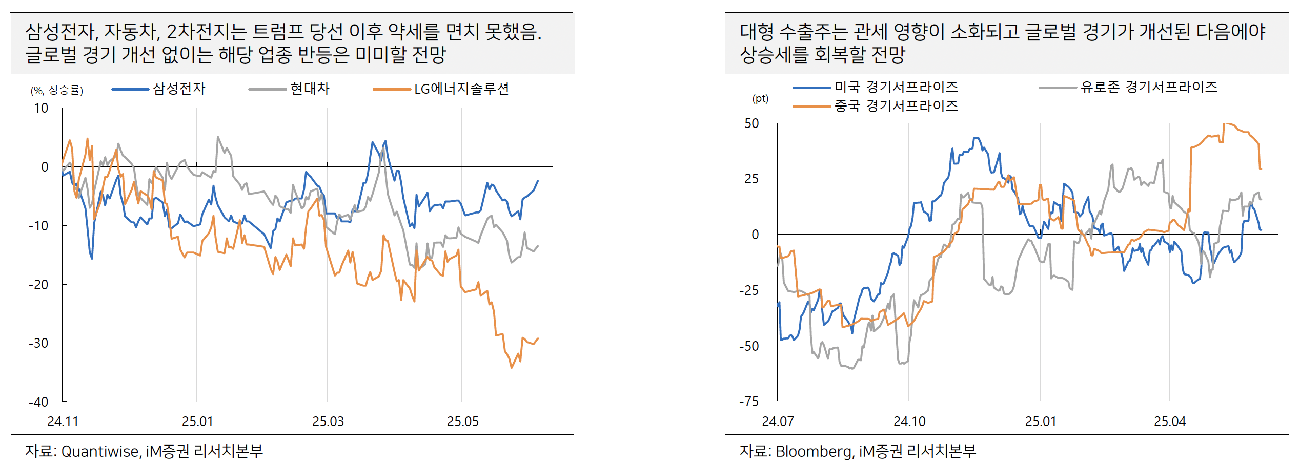- 수출주는 관세 이슈가 해소되고 실적 개선 조짐이 나와야만 비로소 재평가를 받을 수 있습니다.