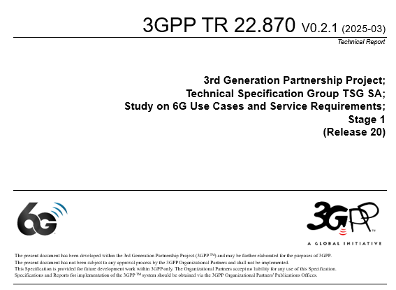 다음은 3GPP TR 22.870 V0.2.1 (2025-03) 문서의 핵심 내용을 정리한 요약입니다. 이 문서는 6G 기술을 위한 사용 사례(use cases)와 서비스 요구사항(service requirements)을 정의한 초기 기술보고서(Stage 1)로, Release 20에 해당합니다.