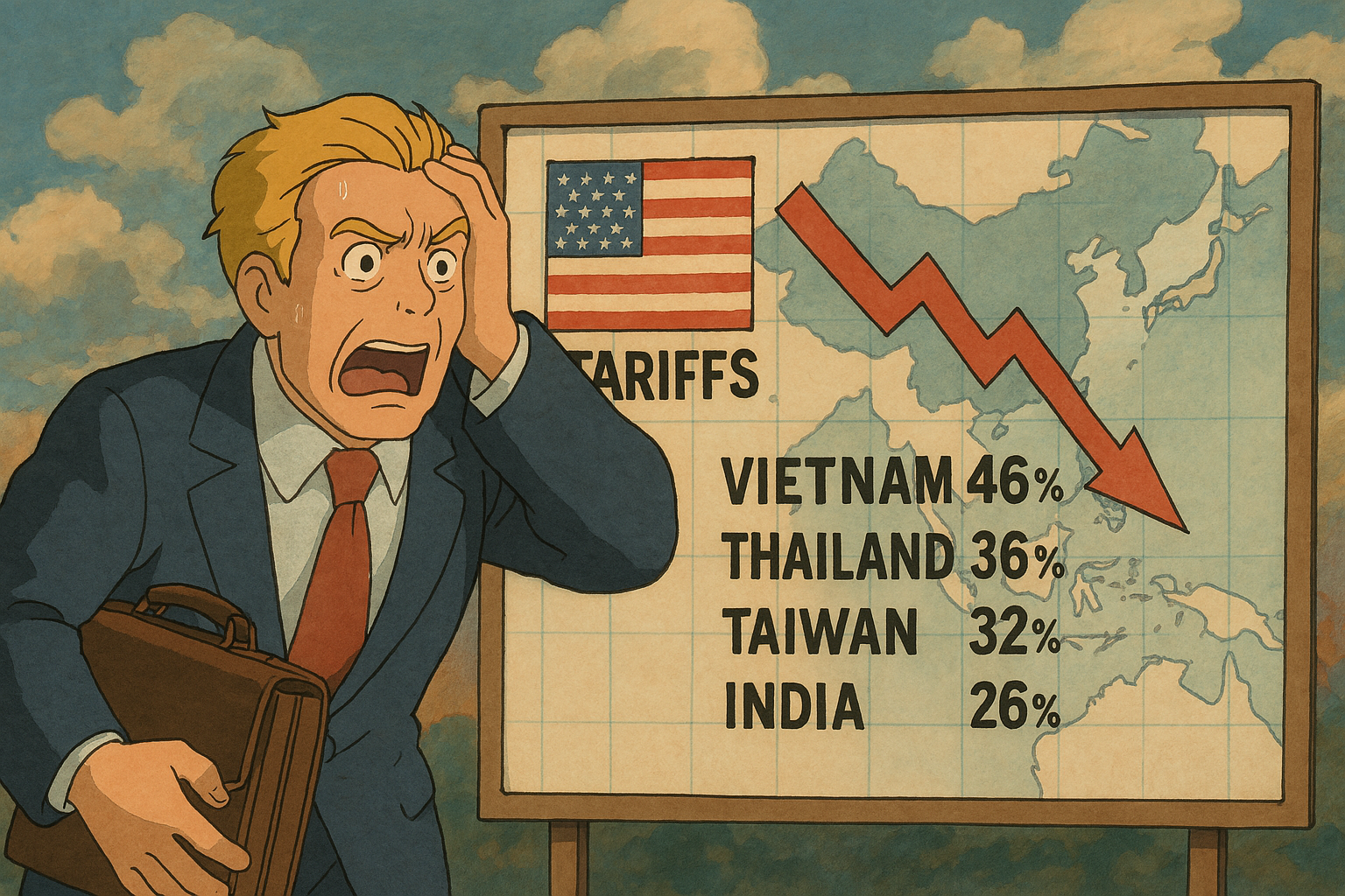 하지만 2025년 4월, 트럼프 전 대통령은 이 흐름을 정면으로 거스르는 새로운 관세 정책을 발표합니다. 미국과 우호 관계에 있었던 동남아 및 아시아 국가들에 최대 46%에 달하는 고율 관세를 부과하며, 기업들이 몇 년간 구축해온 탈중국 전략을 송두리째 흔들고 있는 것입니다.