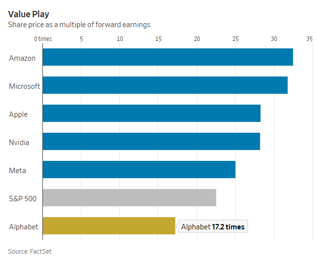 현재 알파벳의 주가는 향후 1년 실적 기준 약 17배의 PER(주가수익비율)로, 경쟁사 평균인 29배보다 크게 낮은 수준입니다. 단순히 저렴하다고 해서 매력적인 투자처는 아닐 수 있습니다.