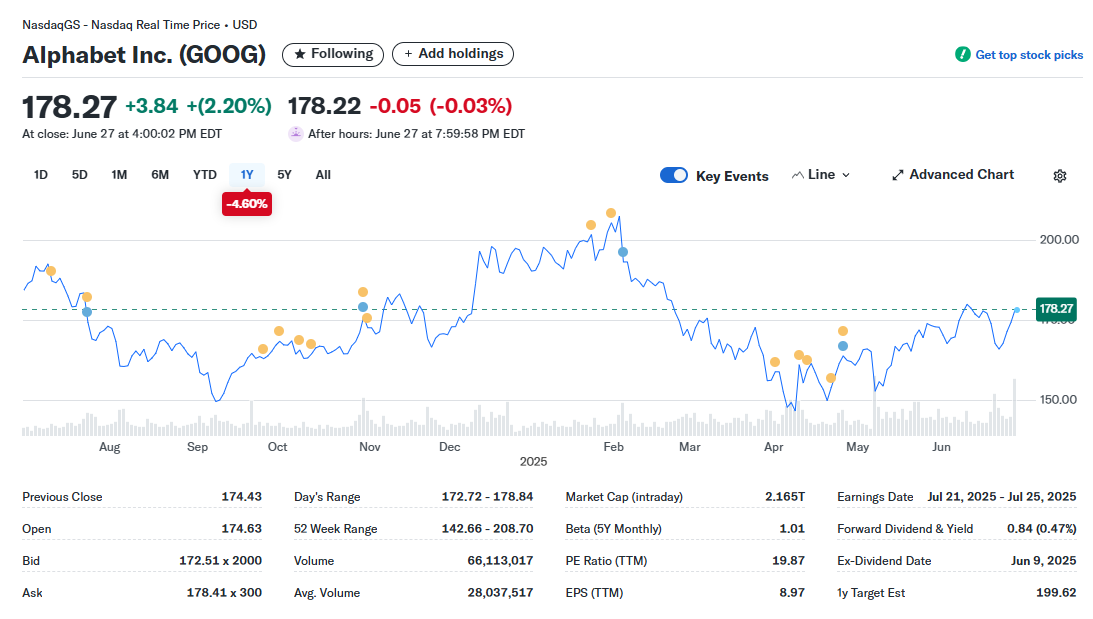 이러한 불확실성은 주가에도 반영되고 있습니다. 알파벳(구글 모회사)의 주가는 I/O 키노트 이후 하락했고, 올해 들어서만 13%나 떨어졌습니다. 이는 주요 빅테크 기업 중 유일하게 12개월간 시가총액이 줄어든 사례입니다.