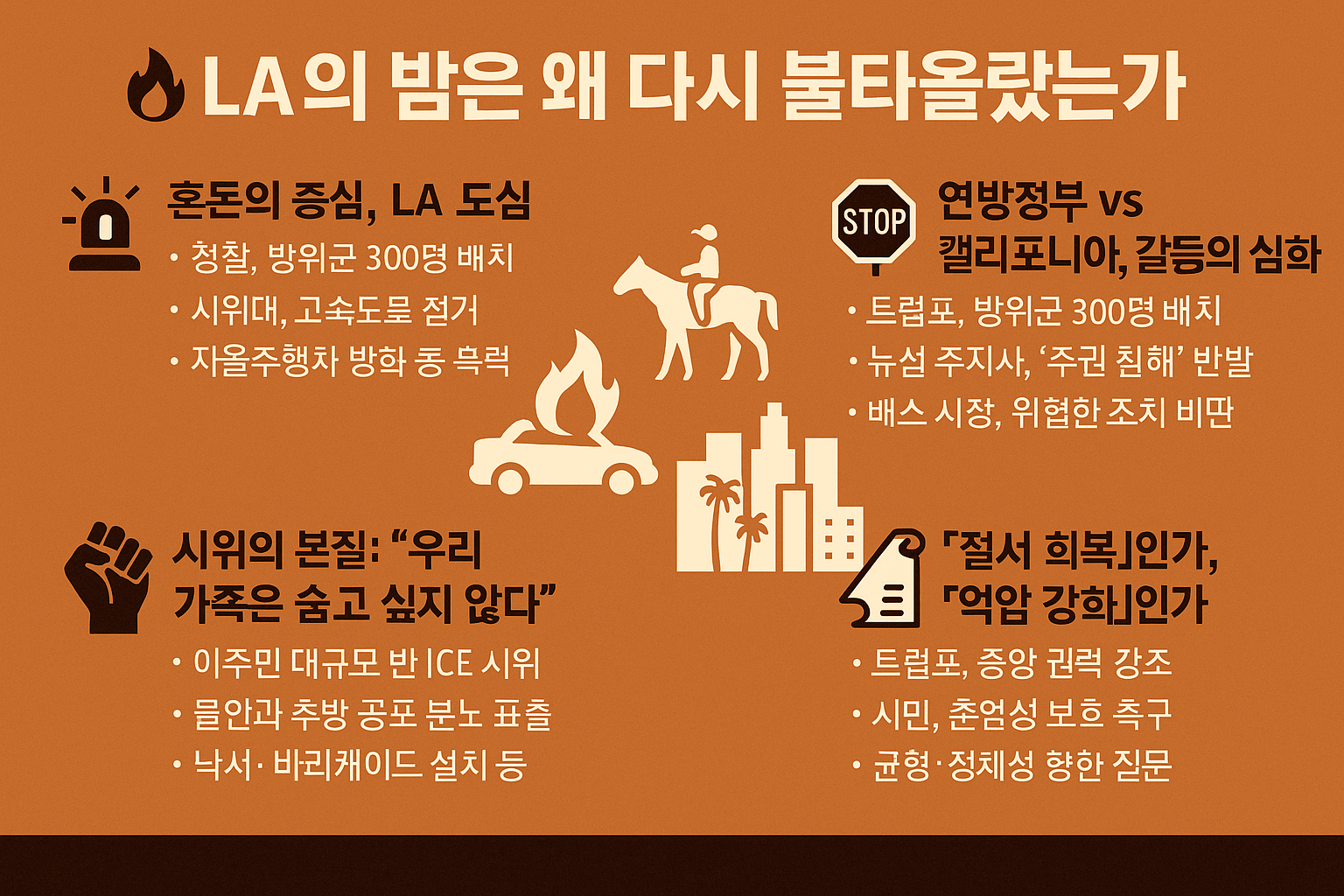 로스앤젤레스의 밤은 단순한 소요 사태가 아닙니다. 그것은 미국이라는 국가가 지금 어디로 가고 있는지를 보여주는 사회적 경고음이자 민주주의의 경계선을 시험하는 현장입니다.