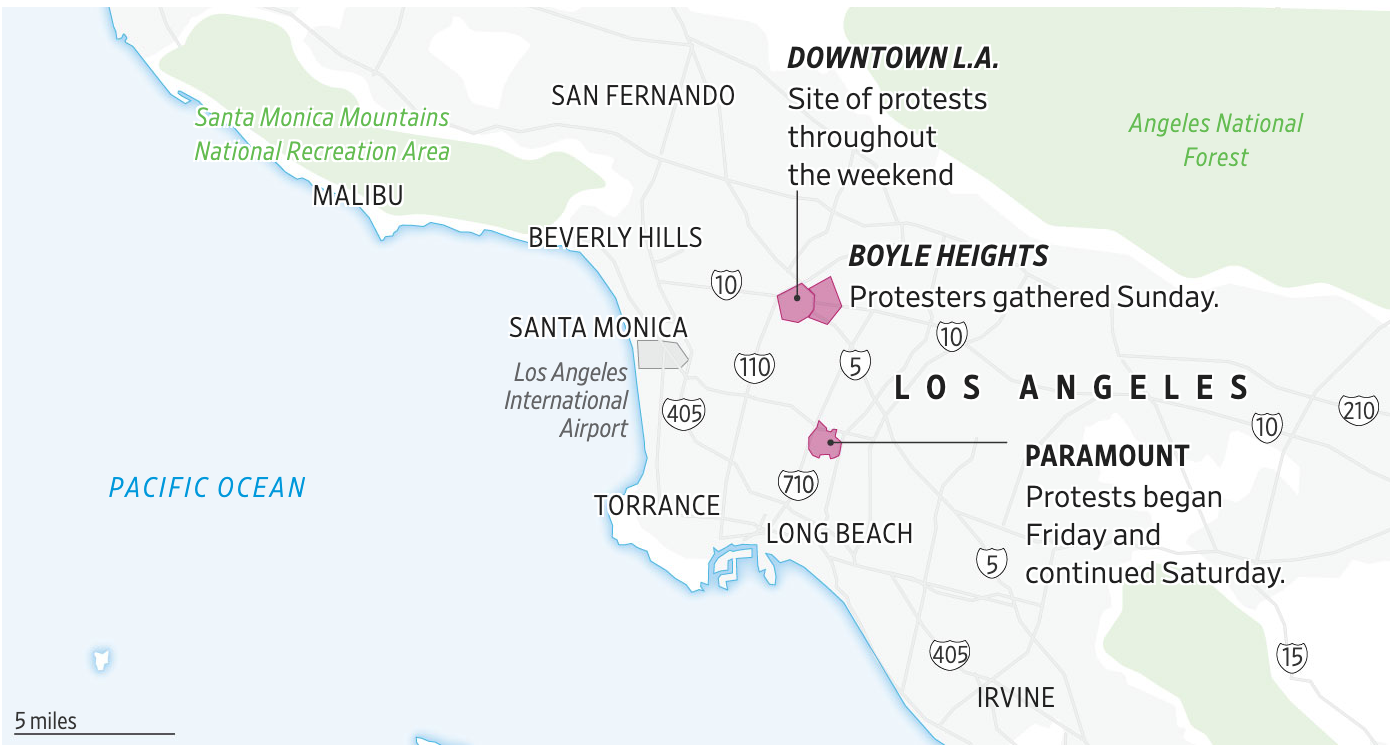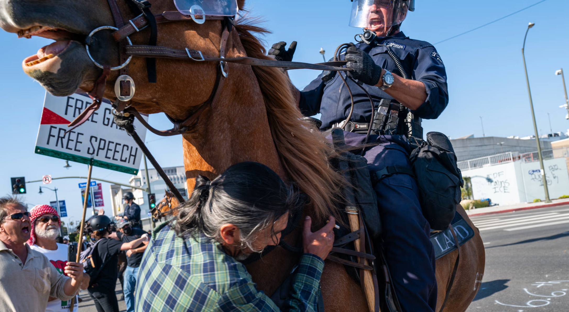 현장에서는 기마 경찰이 말 위에 올라 시위대를 해산하려 했고, 그 와중에 발생한 혼란 속에서 시위대 일부는 망치로 연방 건물 주변의 화단, 볼라드, 인도 구조물을 깨부수고 돌을 던졌습니다. 경찰은 이러한 행위를 공공기물 파손 및 폭력 행위로 간주하고 체포에 나섰으며, LA경찰국(LAPD)과 캘리포니아 고속도로 순찰대(CHP)가 합동으로 최소 27명을 연행했습니다.