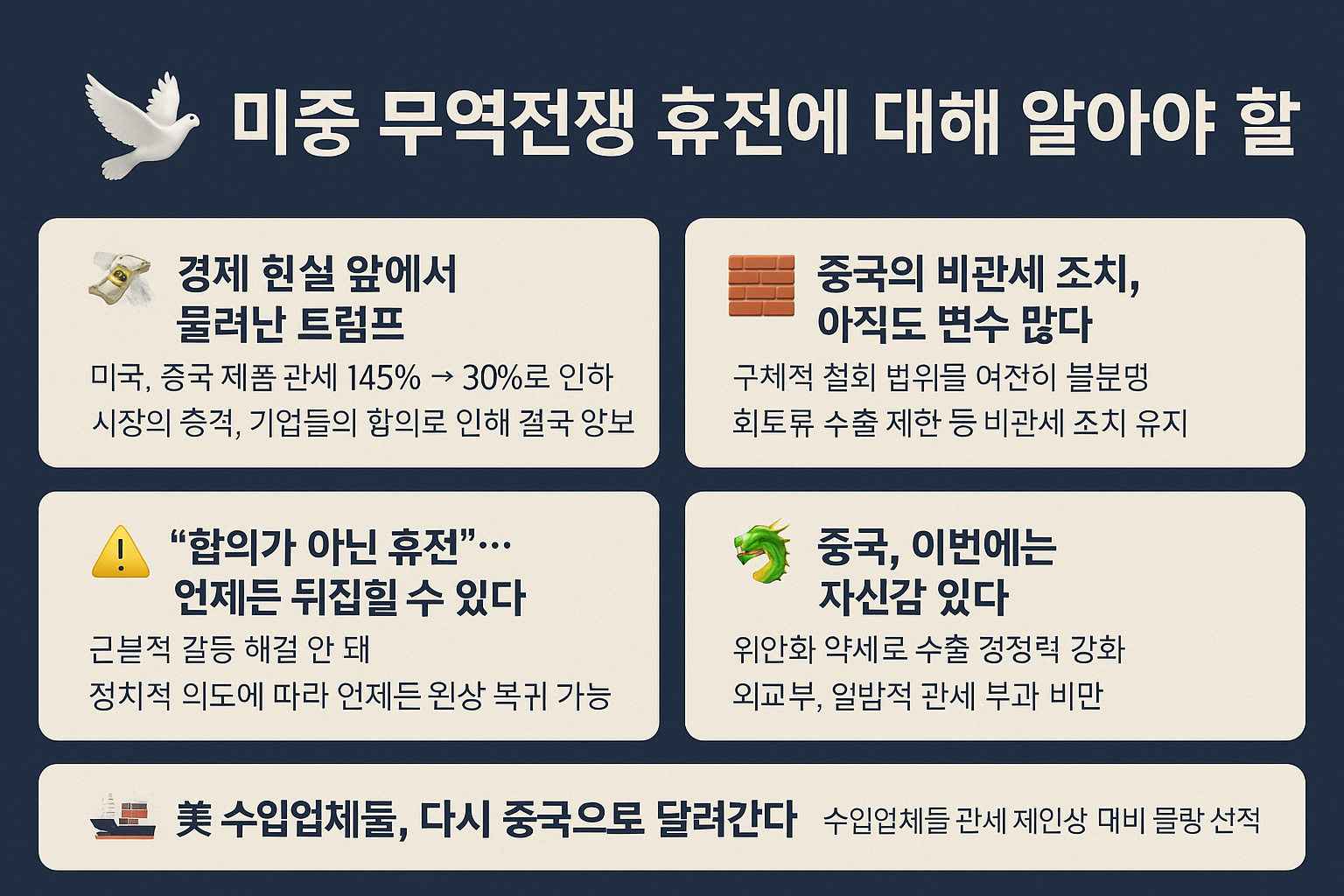 결국 이번 타협은 무역 전쟁의 ‘휴지기’일 뿐이며, 그 불씨는 여전히 살아 있고, 트럼프의 돌발성 정치 행보가 변수로 남아 있습니다.
