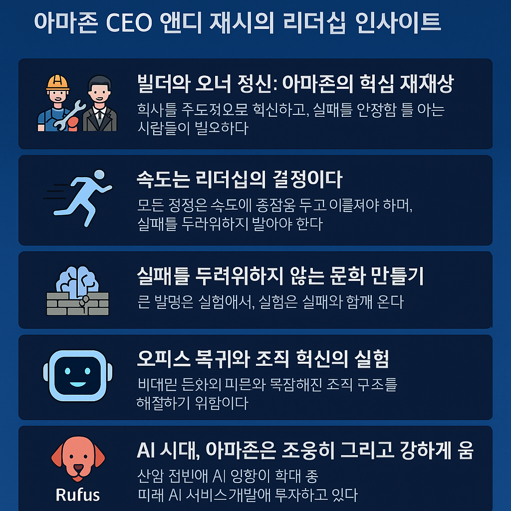 재시는 “빌더(builder)”와 “오너(owner)”의 중요성을 강조합니다. 빌더는 문제를 재정의하고 새롭게 설계하는 사람들, 오너는 회사의 돈처럼 자신의 책임을 다하는 사람들입니다. 아마존은 가능한 한 의사결정을 실무자 수준까지 끌어내려, 속도와 주도권을 동시에 추구합니다.