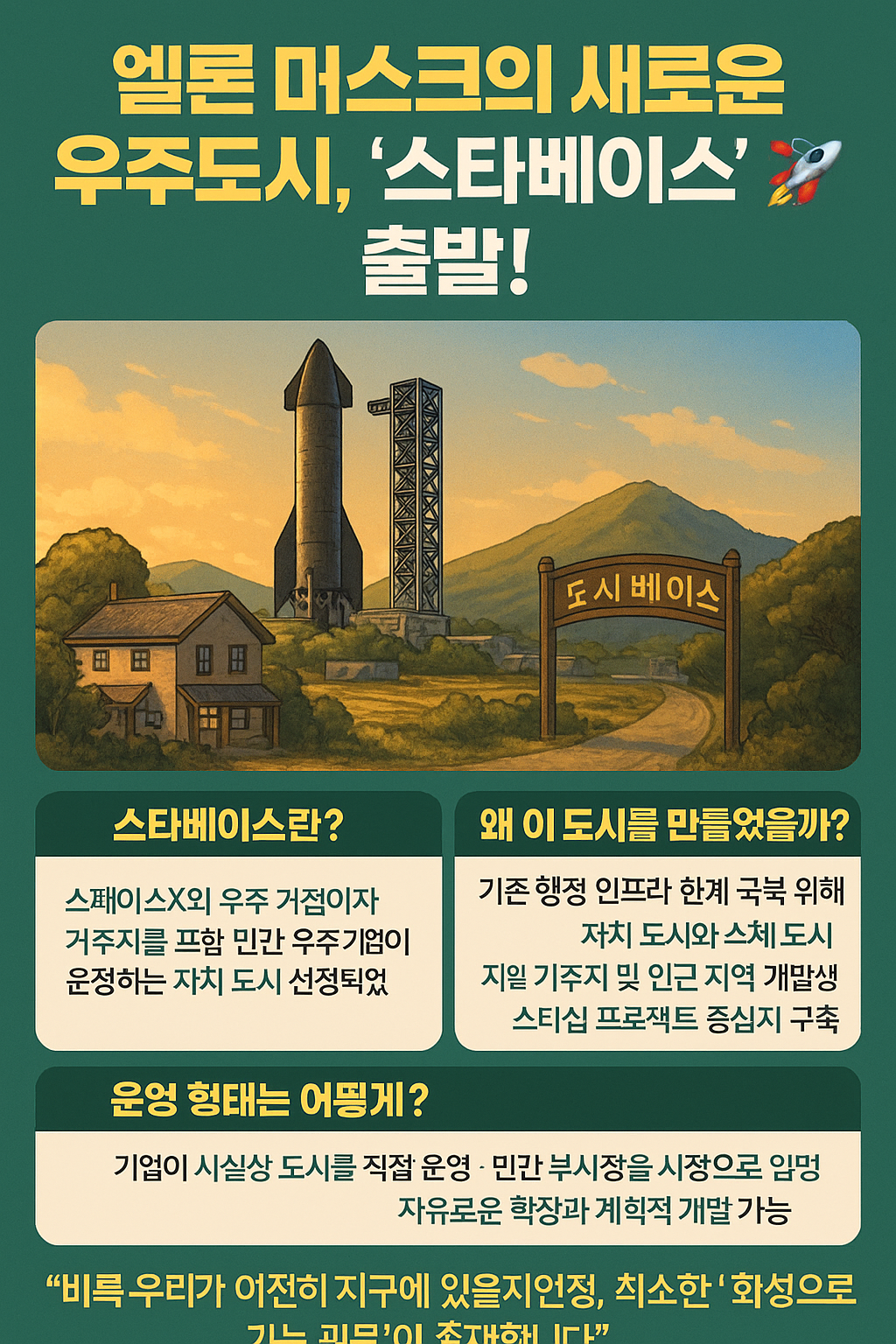 스타베이스의 도시화는 단순한 개발 계획이 아니라, 민간 우주 기업이 도시를 만드는 최초의 사례라는 점에서 상징적입니다.