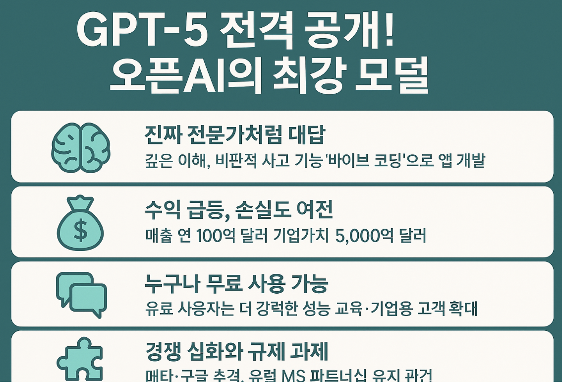 GPT-5는 오픈AI의 야심 찬 전략을 상징합니다. **“모두를 위한 AI”**라는 철학을 유지하면서도, 수익성과 지속가능성을 동시에 추구하는 구조로 설계된 것이죠.