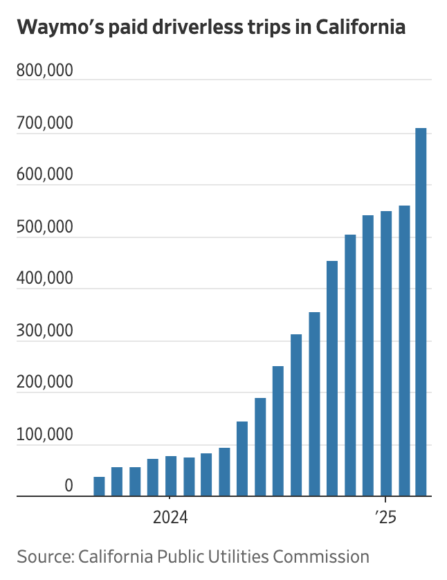 웨이모 역시 마찬가지입니다. 2023년 말 누적 유료 승차 100만 건을 넘긴 후, 2024년 말엔 500만 건을 기록했고, 2025년 상반기 중반도 채 지나기 전에 1천만 건을 돌파했습니다. 이 추세라면 2025년 연말까지 2천만 건을 넘길 가능성이 매우 높습니다. 이 속도는 ‘기술의 마법’이 대중화되는 전환점, 즉 임계치를 이미 넘어섰다는 걸 의미합니다.