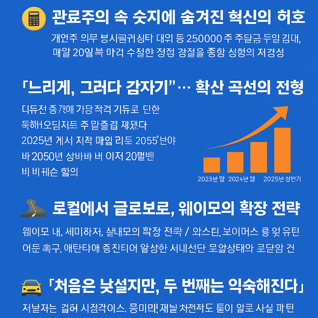 2025년, 자율주행차는 더 이상 SF 영화 속 상상이 아니라 당신이 살고 있는 도시의 현실입니다. 웨이모는 이미 수백만 건의 탑승 데이터를 통해 안전성과 효율성을 입증했고, 사람들은 이제 "운전자 없는 차를 탈 수 있을까?"라는 질문보다, "왜 이 구역엔 웨이모가 안 되지?"라고 말합니다.
