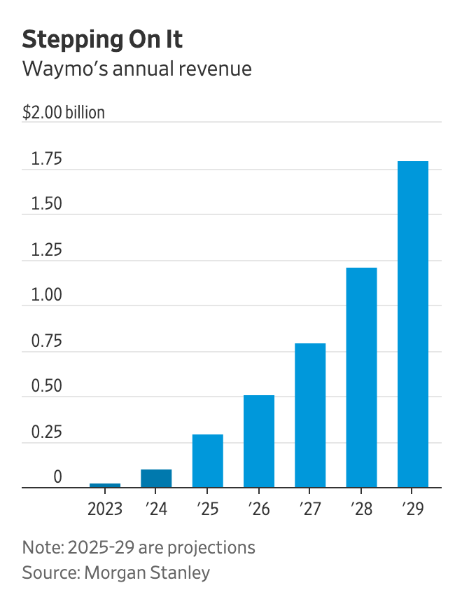 웨이모는 작년 투자 라운드에서 56억 달러를 유치하며 450억 달러의 기업가치를 인정받았고, 레이먼드 제임스의 애널리스트는 기초적 기업가치를 1,500억 달러 수준으로 평가하기도 했습니다.