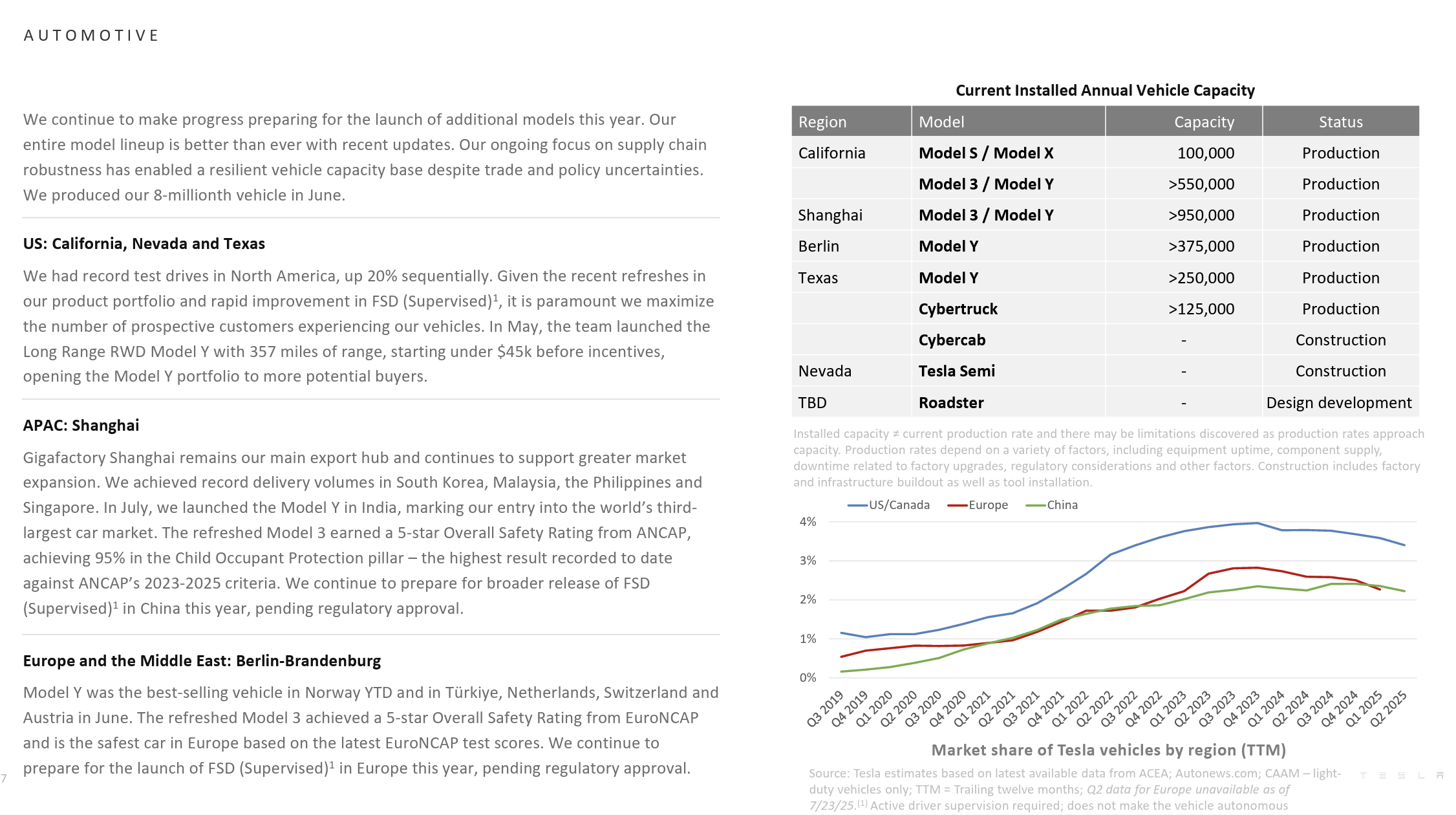 - 중국: 로컬 메이커(Xpeng·샤오미·니오 등)의 신기록 행진 속에서 테슬라는 전년 대비 역성장 구간을 통과 중입니다. 분기 내 신변종(Y 6인승 등)으로 완만한 보정을 시도하지만 경쟁 강도는 더 세졌습니다.