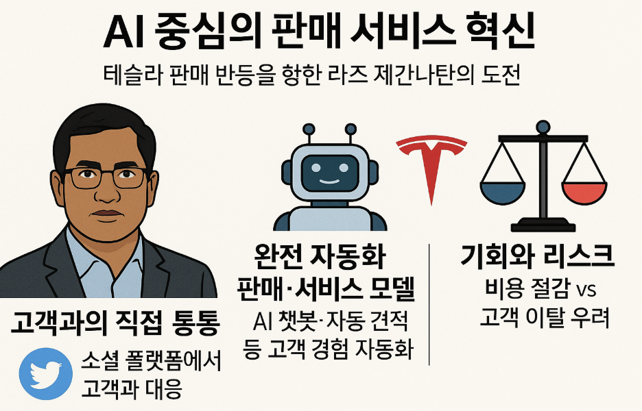 테슬라는 지금 단순한 판매 회복을 넘어 자동화와 AI로 무장한 새로운 판매·서비스 패러다임을 시험하고 있습니다. 라즈 제간나탄의 리더십은 성공할 경우 자동차 업계의 게임 체인저가 될 수 있지만, 실패한다면 고객 이탈을 가속화할 위험도 큽니다.