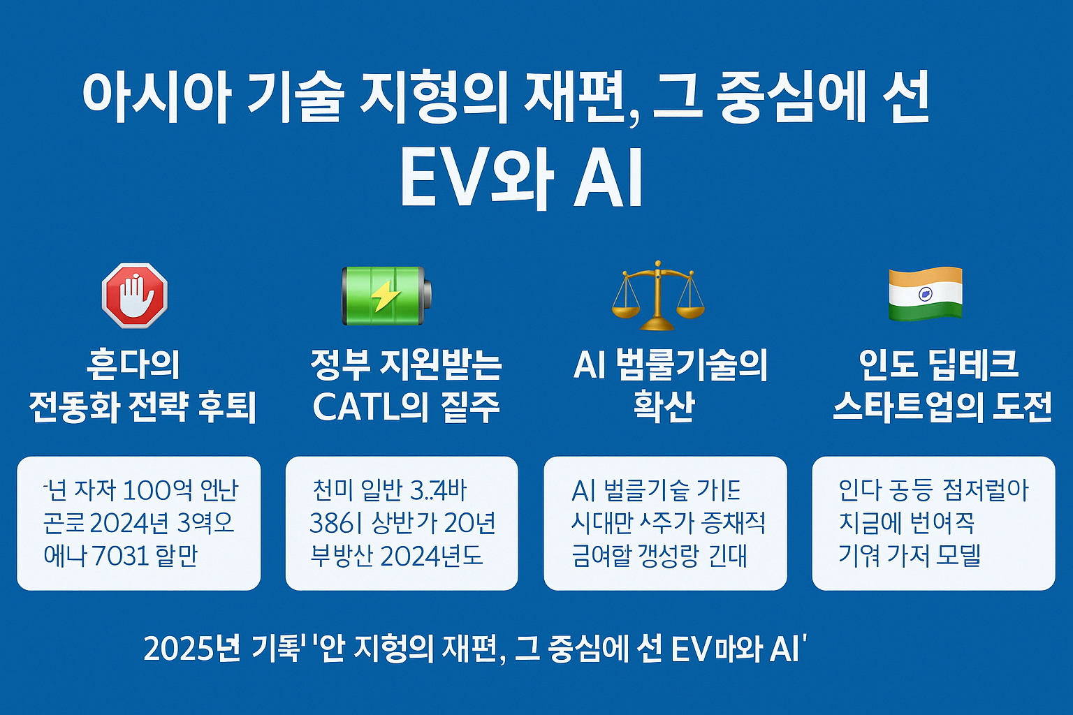 2025년의 아시아 기술 산업은 어느 해보다도 복잡하고 역동적인 전환기에 들어섰습니다. 과거에는 하드웨어 중심의 제조 경쟁이 주된 무대였다면, 이제는 **전동화(Electrification)**와 **인공지능(AI)**이 산업 전반의 패러다임을 바꾸고 있습니다. 이러한 변화는 단순한 기술의 진보를 넘어, 국가 정책, 기업 전략, 글로벌 공급망, 정치 리스크 등 복합적인 요소들이 얽혀 있는 '산업 전쟁터'로서의 면모를 보여줍니다.