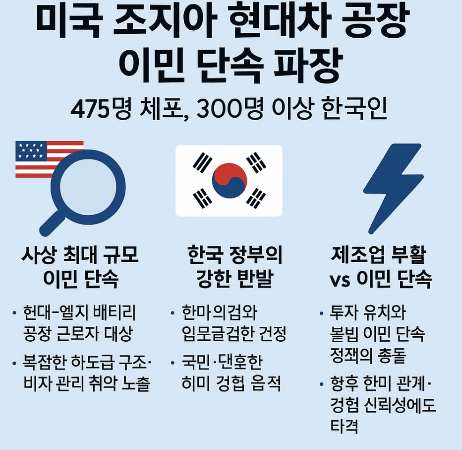 미국 조지아주에서 벌어진 현대자동차–LG에너지솔루션 합작 배터리 공장 이민 단속 사건은 단순한 법 집행 사례를 넘어, 산업·외교·정치 전반에 걸친 복합적 충격을 불러왔습니다. 미국 역사상 최대 규모인 단일 사업장 단속으로 475명이 체포되고, 이 중 300명 이상이 한국 국적자로 확인되면서, 한국 사회는 물론 글로벌 산업계 전체가 흔들렸습니다