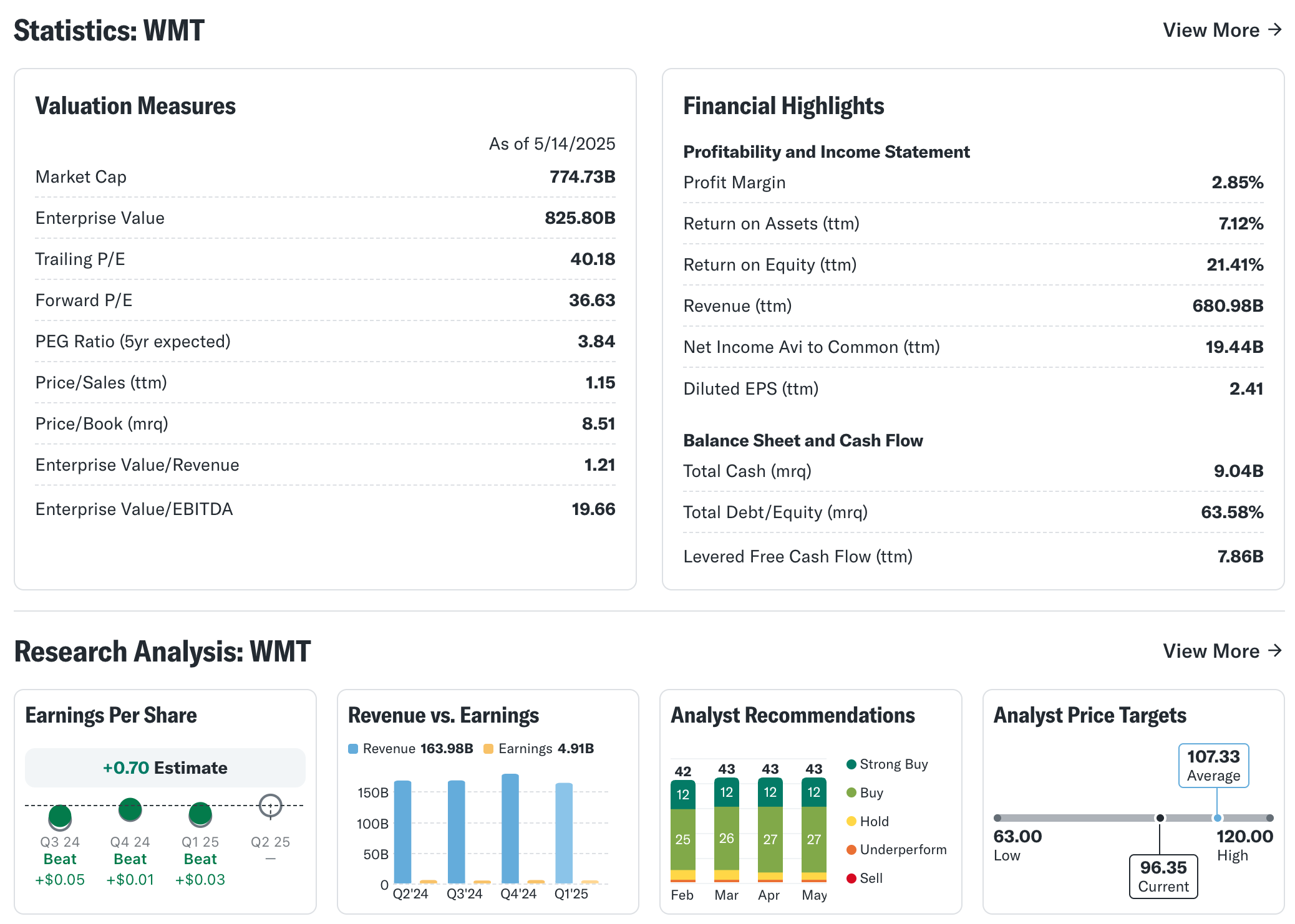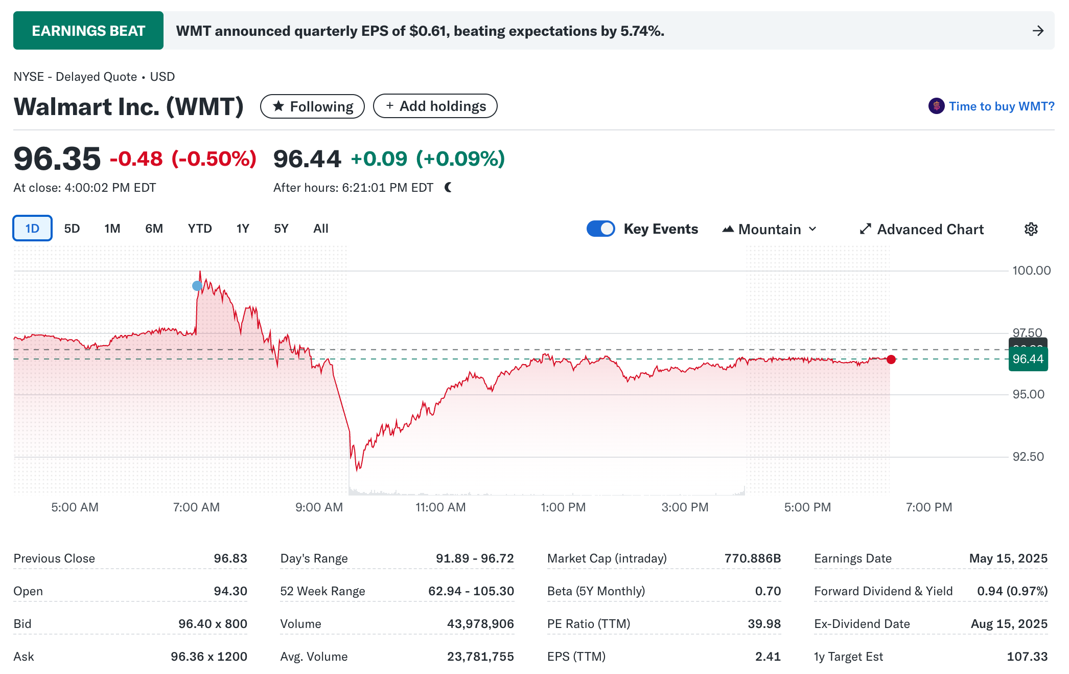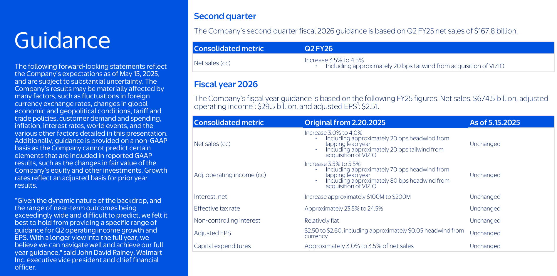 실제로 주식시장이 흔들리고 소비심리가 저하된 3~4월에도 월마트의 실적은 상승했습니다. 이와 같은 탄탄한 실적에 힘입어, 월마트는 올해 전체 매출과 이익 전망치를 변경하지 않고 유지했습니다.