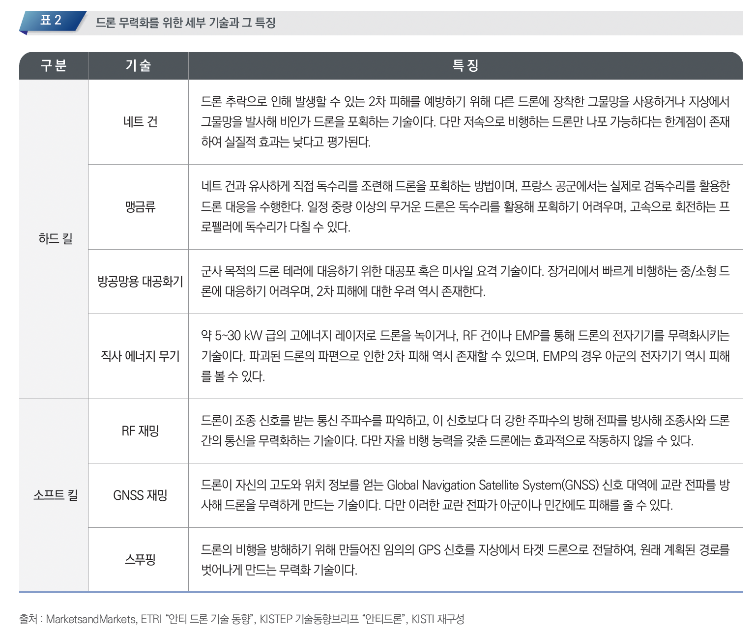 - 무력화 기술: 전파 재밍, GNSS 교란, GPS 스푸핑과 같은 '소프트 킬'과, 물리적으로 드론을 격추하거나 포획하는 '하드 킬' 방식이 있습니다.