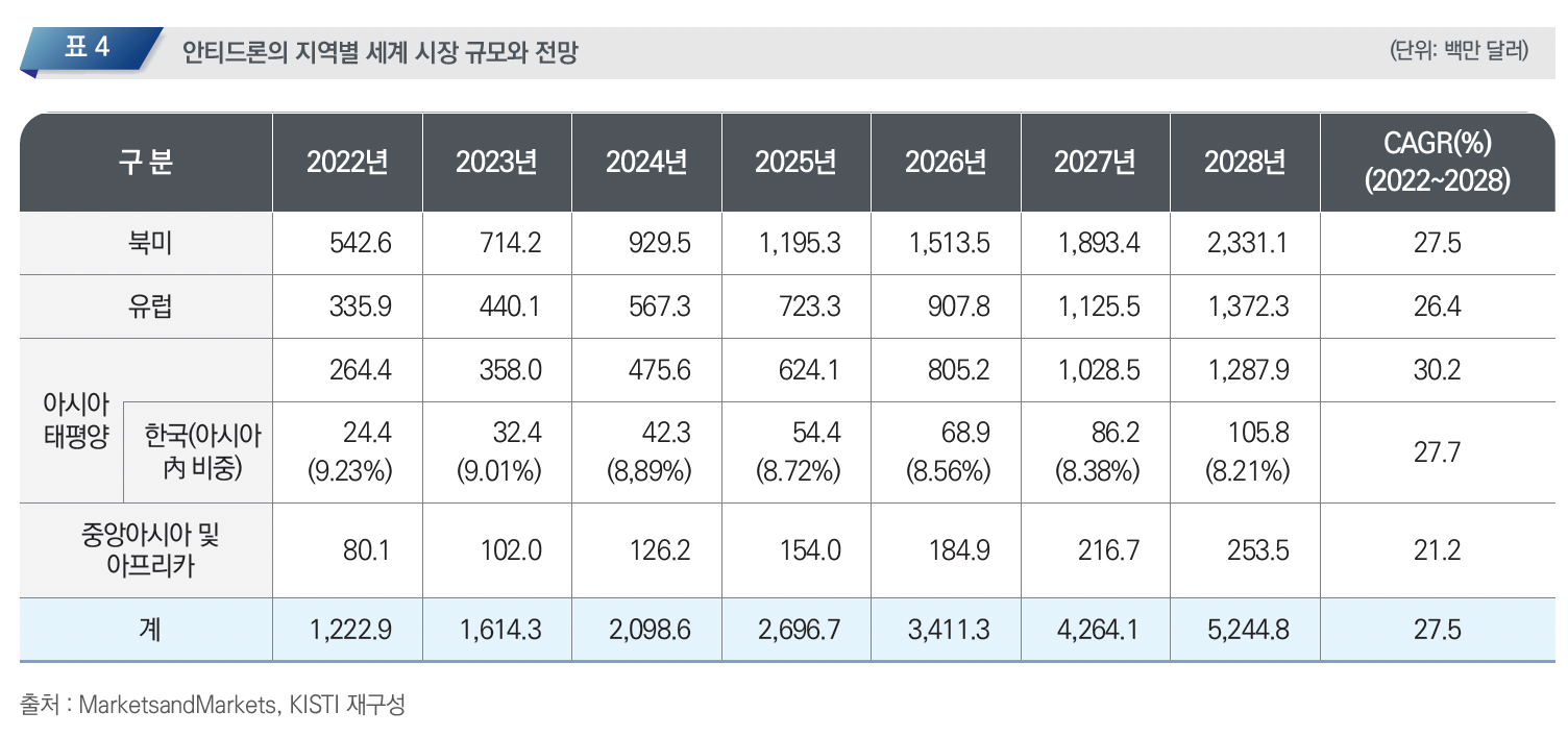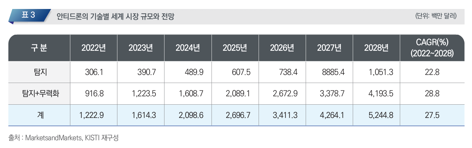 - 탐지+무력화 분야: 2022년 9억 달러 → 2028년 41억 달러 (CAGR 28.8%)