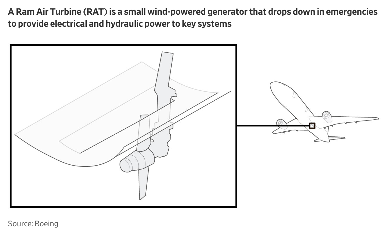 보잉 787의 매뉴얼에 따르면, RAT는 양쪽 엔진이 모두 꺼졌거나 유압 압력 손실, 전기 펌프 이상, 조종석 계기판 정전 등으로 인해 자동 또는 수동으로 작동할 수 있습니다.