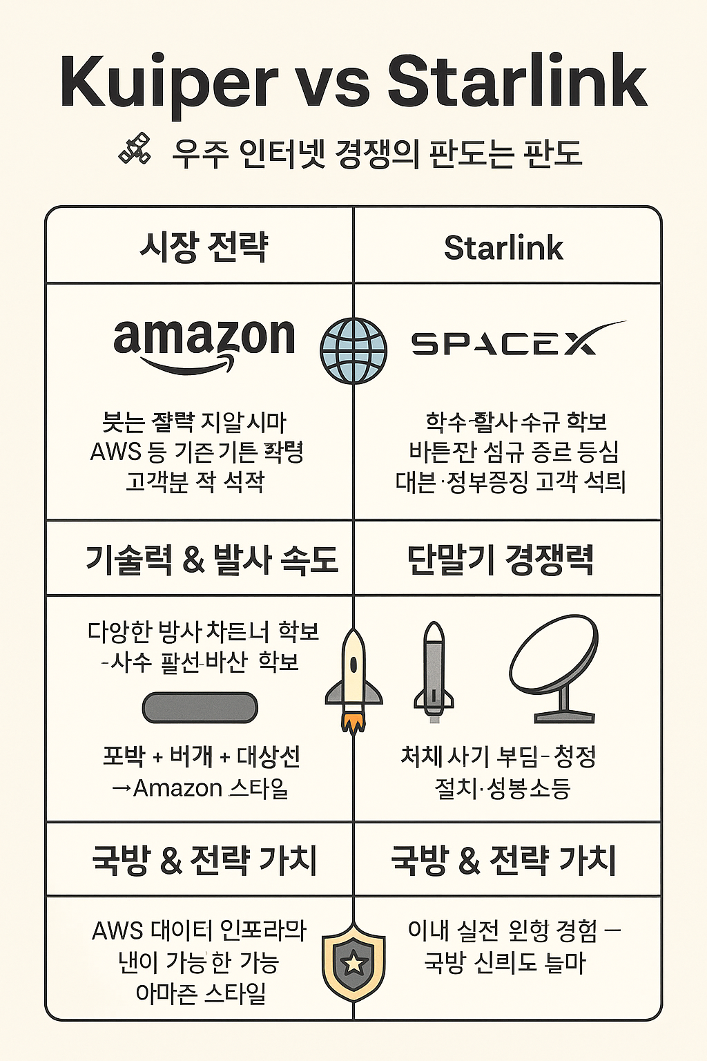 | 전략적 강점 | 전자상거래+클라우드 기반 생태계 연계 | 통합 제조-발사체 보유, 발사 속도 우위 |