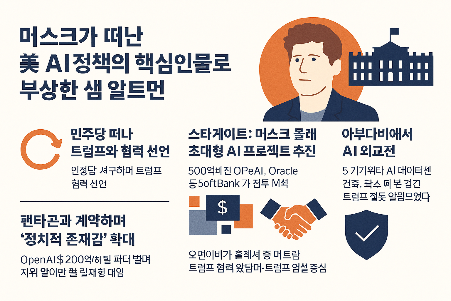 이번 블로그에서는 샘 알트먼이 어떻게 트럼프와의 동맹을 구축하며, 일론 머스크를 제치고 미국 AI 정책의 핵심 인물로 부상했는지, 그 치열한 무대 뒤의 이야기들을 살펴보려 합니다.
