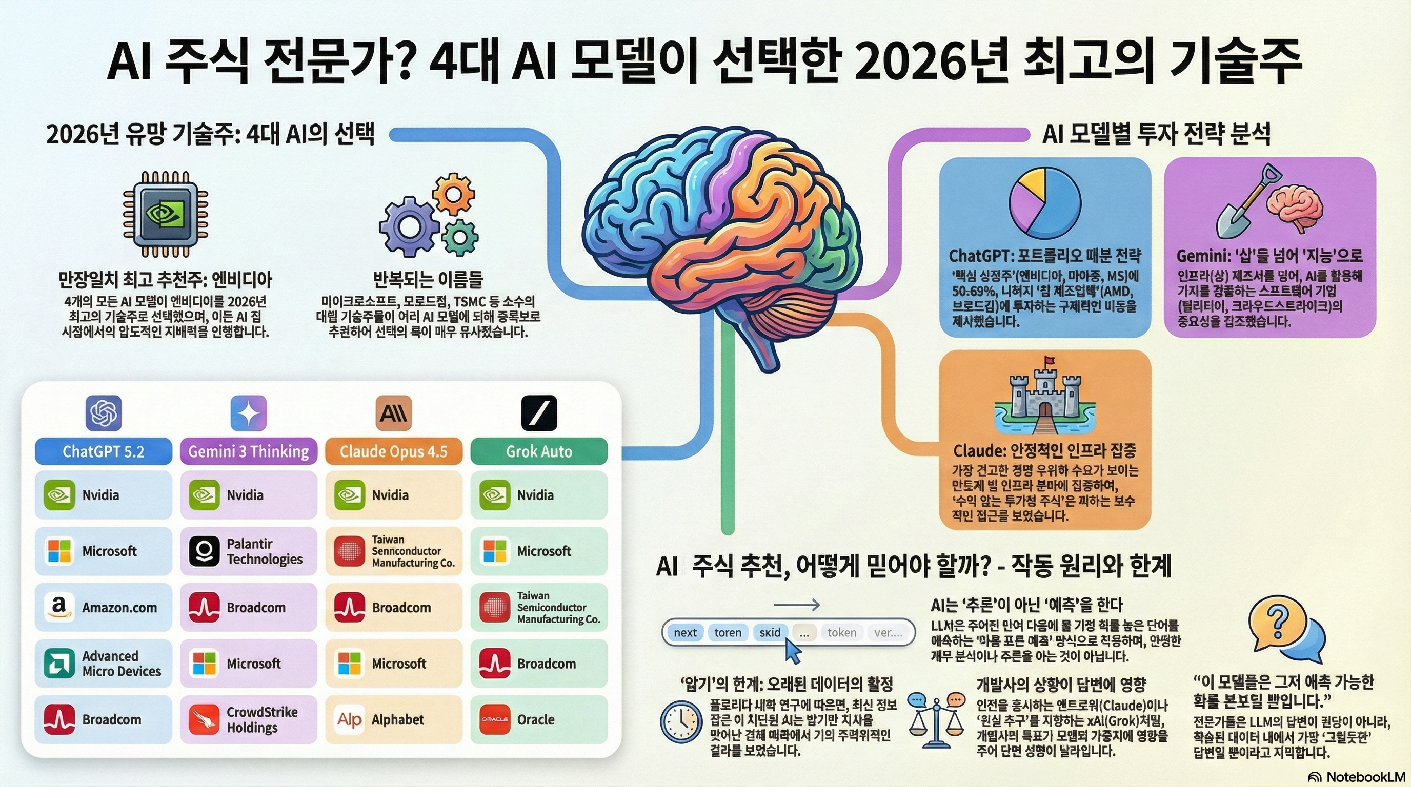 Grok은 가장 이질적인 선택을 했습니다. 오라클을 포함한 결정은 시장의 우려를 정면으로 받아들이면서도, AI 데이터 인프라 전환 과정에서 오라클이 재평가될 수 있다는 역발상적 시나리오를 반영합니다. 이는 Grok이 스스로를 ‘논쟁적이지만 솔직한 모델’로 포지셔닝하려는 방향성과도 맞닿아 있습니다.
