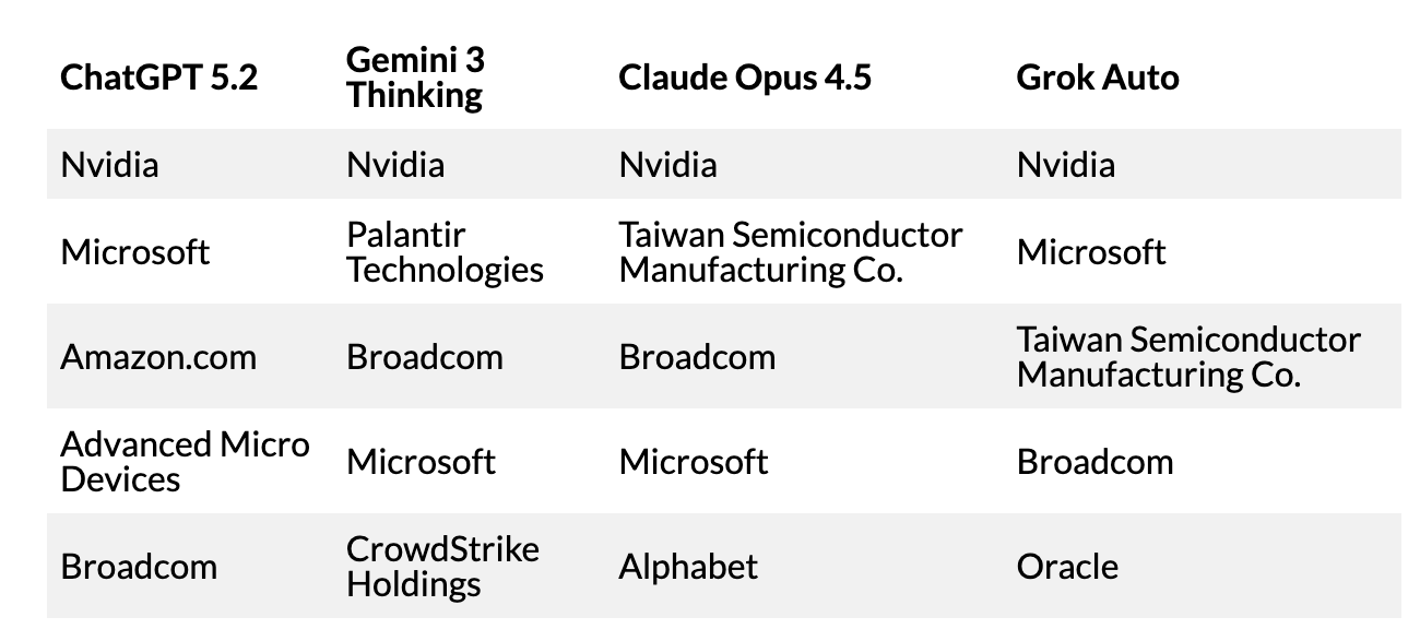 MarketWatch가 주요 LLM들에게 동일한 질문을 던졌을 때 가장 먼저 드러난 특징은, 모든 모델의 선택이 놀라울 정도로 수렴했다는 점입니다. ChatGPT, Gemini, Claude, Grok은 각기 다른 철학과 학습 방향을 가진 모델임에도 불구하고, 최종적으로는 비슷한 이름들을 반복적으로 호출했습니다.