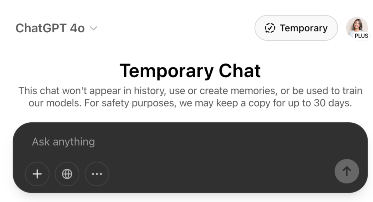 ChatGPT의 '임시 채팅' 모드를 켜면, 해당 대화는 기록되지 않으며 학습에도 사용되지 않습니다.