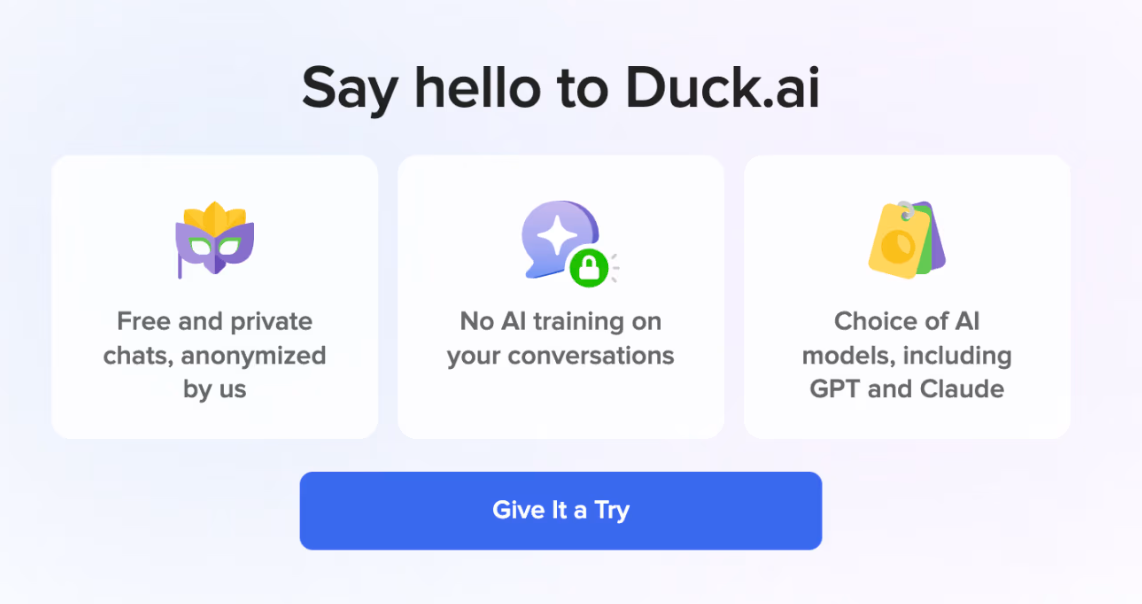 DuckDuckGo에서 제공하는 Duck.ai는 사용자 정보를 익명화해 AI에 전달하고, 학습에도 사용되지 않도록 설계되었습니다.