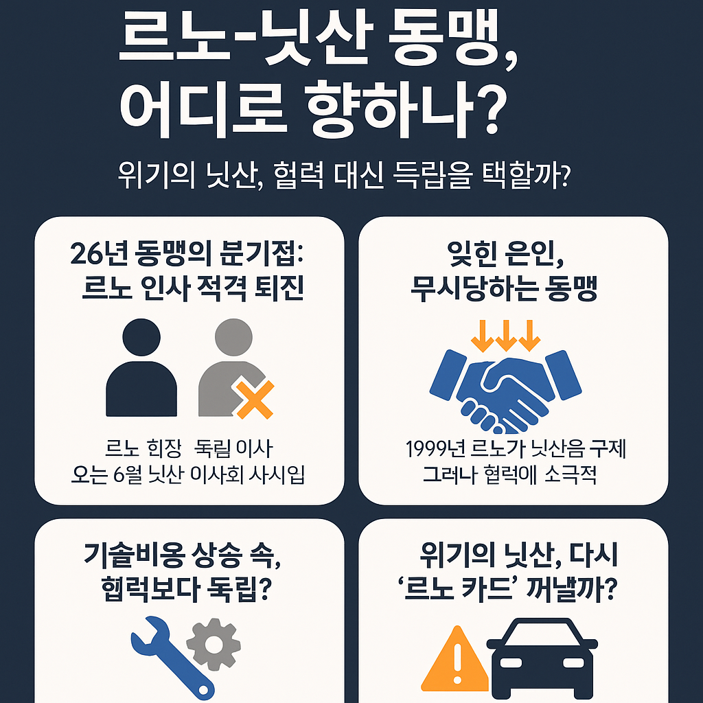 즉, 닛산이 진정한 회생을 꾀하고자 한다면, 르노를 단순히 과거의 파트너로 치부하지 말고, 전략적 재정의의 대상으로 삼아야 할 시점이라는 뜻입니다. 신뢰와 효율성의 균형을 맞춘 새로운 동맹 구조를 모색하는 것—그것이야말로 닛산에게 남은 마지막 회복 카드일지도 모릅니다.