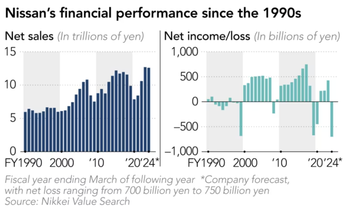 닛산은 2024 회계연도에 6,700억 엔(약 4.5조 원)의 순손실을 기록하며, 사상 최악의 실적을 냈습니다. 이는 전년도 4,266억 엔의 흑자와 극명한 대조를 이룹니다. 이에 따라 닛산은 전 세계 공장 수를 17개에서 10개로 줄이고, 2만 명 규모의 감원도 추진하고 있습니다.
