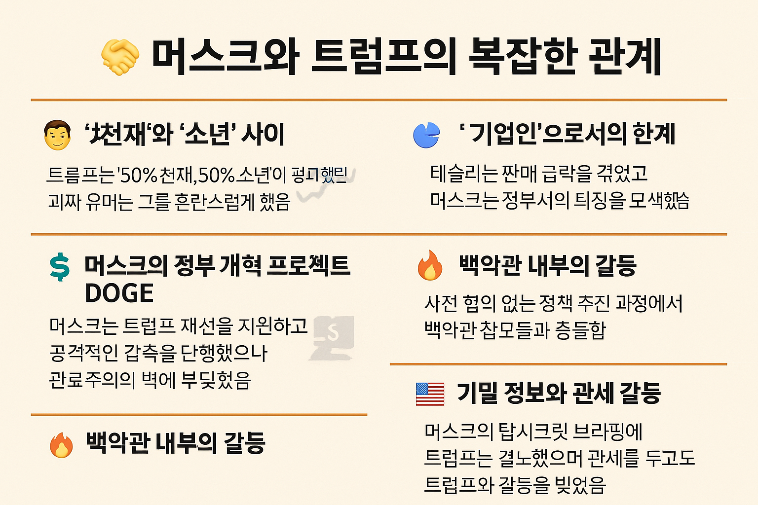 이 블로그에서는 머스크와 트럼프의 관계가 어떻게 형성되고, 어떻게 흔들렸으며, 결국 어떤 결말에 도달했는지를 살펴봅니다. 그들은 동맹이었을까? 아니면 서로를 필요로 했던 계산적인 협력자였을까?