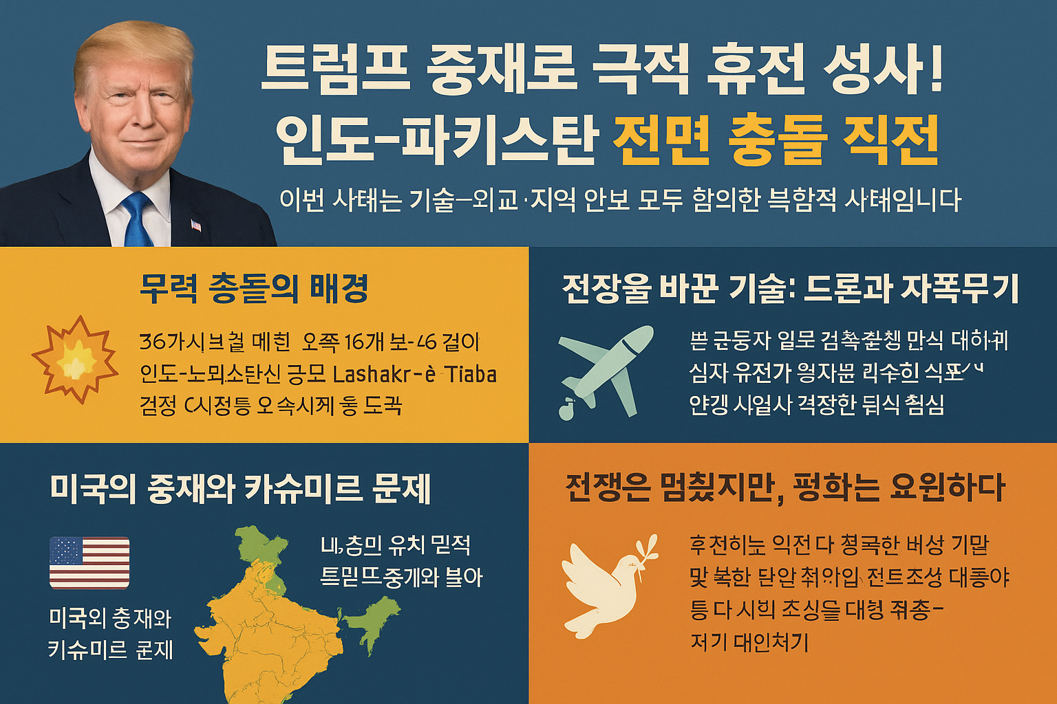 그러던 중, 예상 밖의 극적인 반전이 일어났습니다. 도널드 트럼프 전 미국 대통령의 중재와 외교적 개입을 통해, 인도와 파키스탄은 전격적으로 즉각적이고 전면적인 휴전에 합의한 것입니다. 이번 사태는 단순한 국지 분쟁이 아니라, 기술 변화 속에서의 군사 충돌, 중재 외교의 유효성, 그리고 지역 안보의 불안정성을 모두 함의한 현대 국제정치의 복합적 사례로 기록될 것입니다.