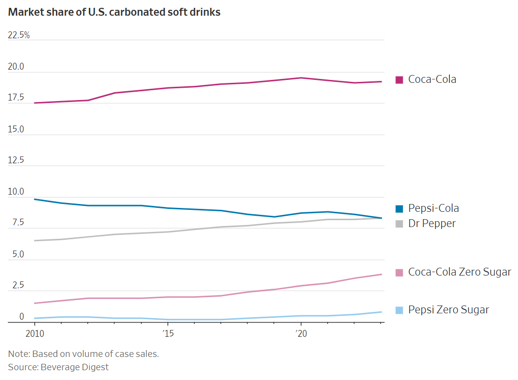 결정적으로, 펩시콜라는 최근 몇 년 사이 미국 내 콜라 시장 점유율 3위로 밀려나는 충격적인 상황을 맞이했습니다. 1위 코카콜라에 이어 2위는 이제 닥터페퍼. 펩시가 수십 년간 유지해온 위상이 무너진 것입니다.