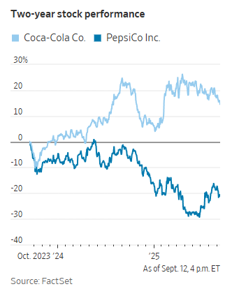 반면 펩시는 스낵 부문(Frito-Lay)의 호황 덕분에 한동안 버텼지만, 최근 원가 상승과 건강 트렌드 변화로 스낵 매출마저 주춤하면서 한계가 드러나고 있습니다. 실제로 지난 2년간 펩시 주가는 20% 하락했지만, 코카콜라는 15% 상승했습니다.
