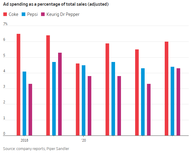 반면 펩시는 매출 대비 광고비 비중이 약 **4.4%**로 코카콜라보다 낮습니다. 광고 투자가 적다 보니 브랜드의 존재감이 점차 약해지고, 그 결과 미국 내에서 펩시콜라의 시장 점유율은 닥터페퍼와 스프라이트에도 밀려 4위까지 내려앉았습니다. 최근 펩시는 과거의 “펩시 챌린지” 캠페인을 재활용하고, 음식과 어울리는 ‘Food Pairing Cola’ 이미지를 강조하고 있지만, 이는 본질적인 브랜드 경쟁력 회복으로 이어지지 못하고 있습니다.
