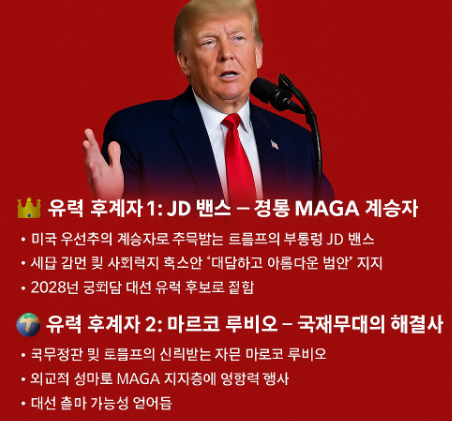 트럼프 대통령은 여전히 차기 지도자 결정의 ‘킹메이커’로 남을 것이며, 공식 후계자 지명은 최대한 늦출 가능성이 높습니다. JD 밴스는 ‘정통 MAGA 계승자’로서의 상징성을, 마르코 루비오는 ‘국제무대의 해결사’로서의 실무 능력을 무기로 각자의 길을 걷고 있습니다.