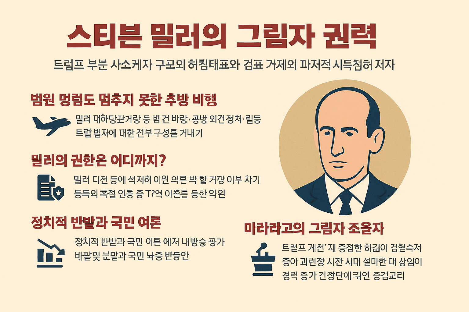 요약하자면, 스티븐 밀러는 이제 백악관 내에서 사법·행정·정치·국방·외교 등 전방위적 영향력을 행사하는 인물이 되었고, 이는 그가 대통령이 아닌 참모라는 점에서 미국 헌정질서에 있어 전례 없는 권력 집중 현상으로 받아들여지고 있습니다.