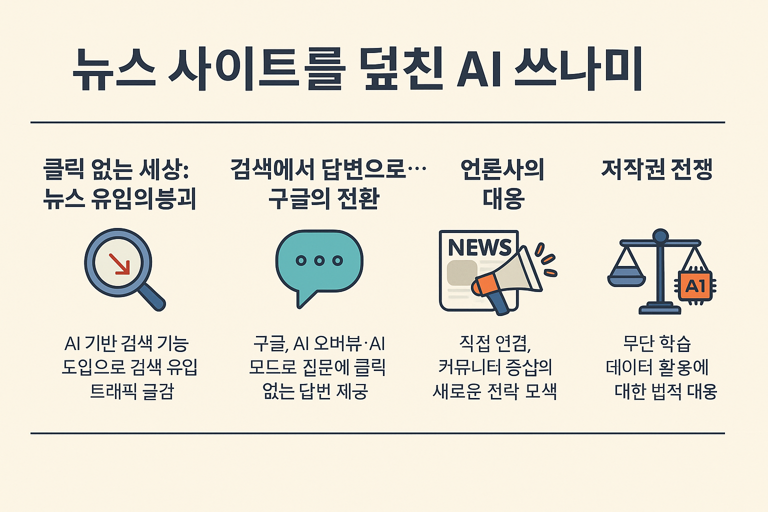 AI는 단순한 기술이 아니라 뉴스 생태계를 근본부터 재편하는 거대한 흐름입니다. 언론사들은 더 이상 구글에 기대어 생존할 수 없으며, 직접 독자와 관계를 맺고, 콘텐츠를 브랜드로 전환해야 할 시대에 진입했습니다.