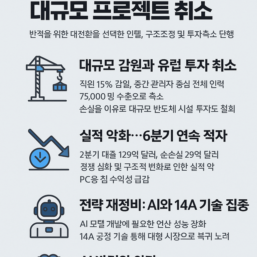 인텔은 전 세계 반도체 시장에서의 부진을 반전시키기 위해 뼈를 깎는 구조조정에 나섰습니다. 그 핵심은 직원 15% 감원과 수십조 원 규모의 신규 투자 계획 취소입니다. 이번 결정은 단순한 비용 절감 차원을 넘어, 인텔의 전략 전환을 상징하는 조치로 평가받고 있습니다.
