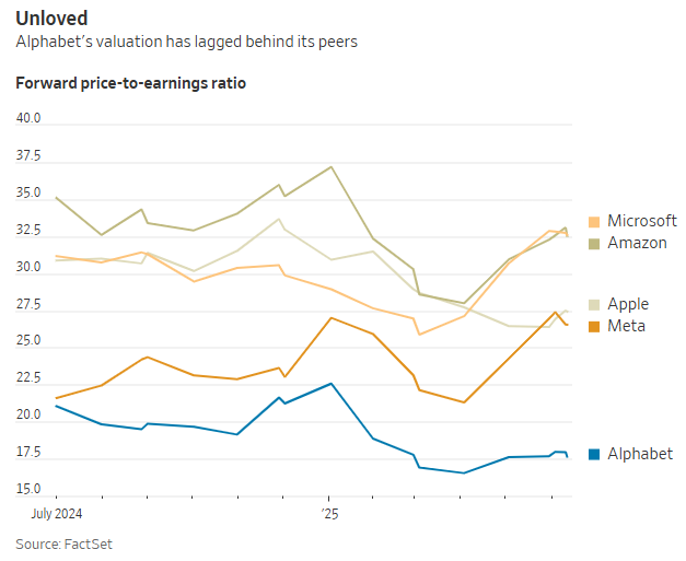 2025년 현재 알파벳의 미래 주가수익비율(PER)은 약 18배 수준으로, 이는 같은 AI 경쟁자인 마이크로소프트(32배), 아마존(32배) 대비 절반 수준에 불과합니다.