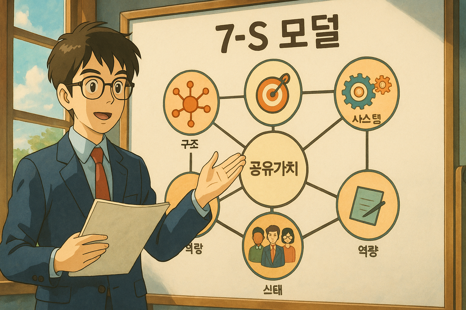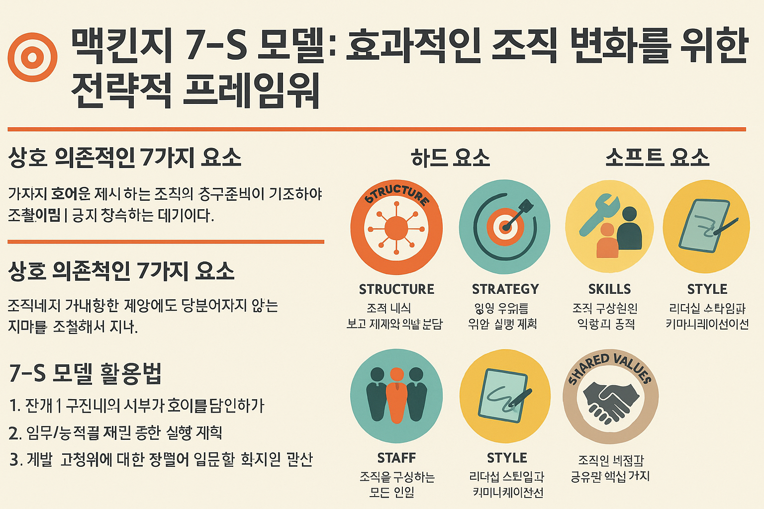 조직이 성장하고 복잡해질수록, 단순히 구조나 전략만으로는 성공을 담보하기 어렵습니다. 이럴 때 유용한 분석 도구가 바로 **맥킨지의 7-S 모델(7-S Model)**입니다. 이 모델은 조직의 핵심 요소 7가지를 조화롭게 정렬해야 진정한 변화와 성장을 이룰 수 있다는 통찰에서 출발합니다.