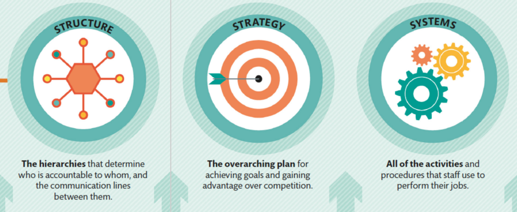 시스템은 눈에 잘 띄지 않지만, 구성원의 행동을 자동적으로 유도하는 역할을 하기에 매우 중요합니다. 시스템이 잘 정비되어 있지 않으면, 아무리 좋은 전략과 구조가 있어도 실무에서 실행되지 않게 됩니다.