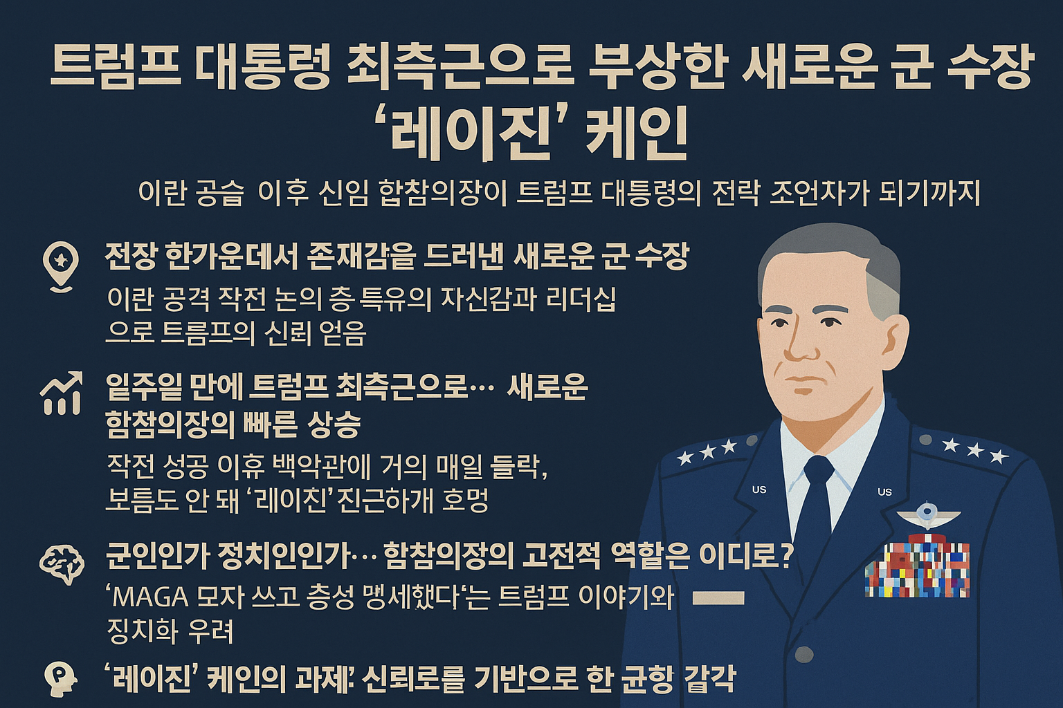미국 역사에서 대통령과 군 지도자의 관계는 늘 국가 안보와 정치의 균형을 상징해 왔습니다. 그러나 트럼프 대통령의 재임기에는 이 전통적 균형이 흔들리고 있습니다. 특히 최근 이란에 대한 정밀 타격 작전 이후, 단 케인(Dan Caine) 장군이 새로운 합참의장으로 주목받으며, 군과 대통령 간의 새로운 동력 구조가 형성되고 있다는 분석이 나오고 있습니다.