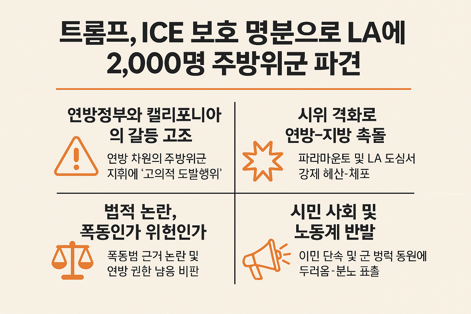 도널드 트럼프 전 대통령이 주방위군 2,000명을 연방 지휘 아래 LA에 배치하겠다고 발표하면서, 단순한 지역 사건은 미국 정치의 뿌리를 뒤흔드는 상징적 사건이 되었습니다. 특히 이번 조치는 이민 문제, 연방 권한, 시민 저항, 그리고 법의 한계라는 네 가지 이슈가 맞물리며 복합적인 갈등 구조를 드러내고 있습니다.