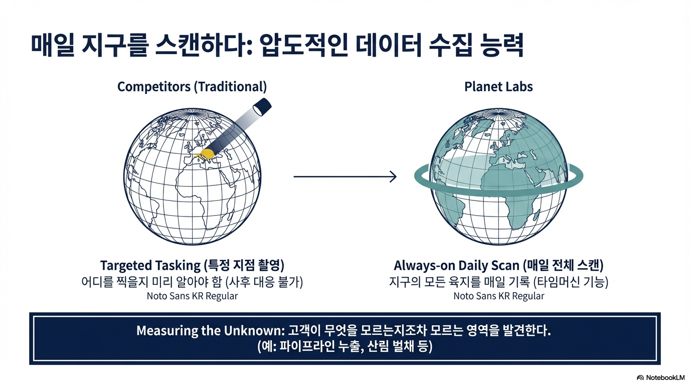 플래닛 랩스의 경쟁력은 단순히 고해상도 위성 사진을 제공하는 데 있지 않습니다. 이들이 다른 기업과 근본적으로 다른 점은, 이미 알고 있는 대상을 더 선명하게 보는 것이 아니라 "무엇이 있는지조차 모르는 새로운 영역을 탐지"하고 측정하는 능력에 있습니다.